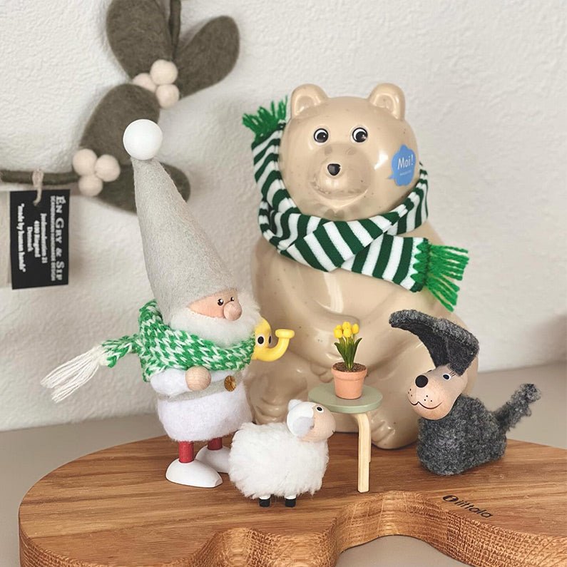イルムスでも人気の、2023年バージョンのしろくま貯金箱と一緒に📸ニッセドールのマフラーがおそろいでかわいいですね🧶みんなでお花を囲んで、どんなお話をしているのでしょう・・😌