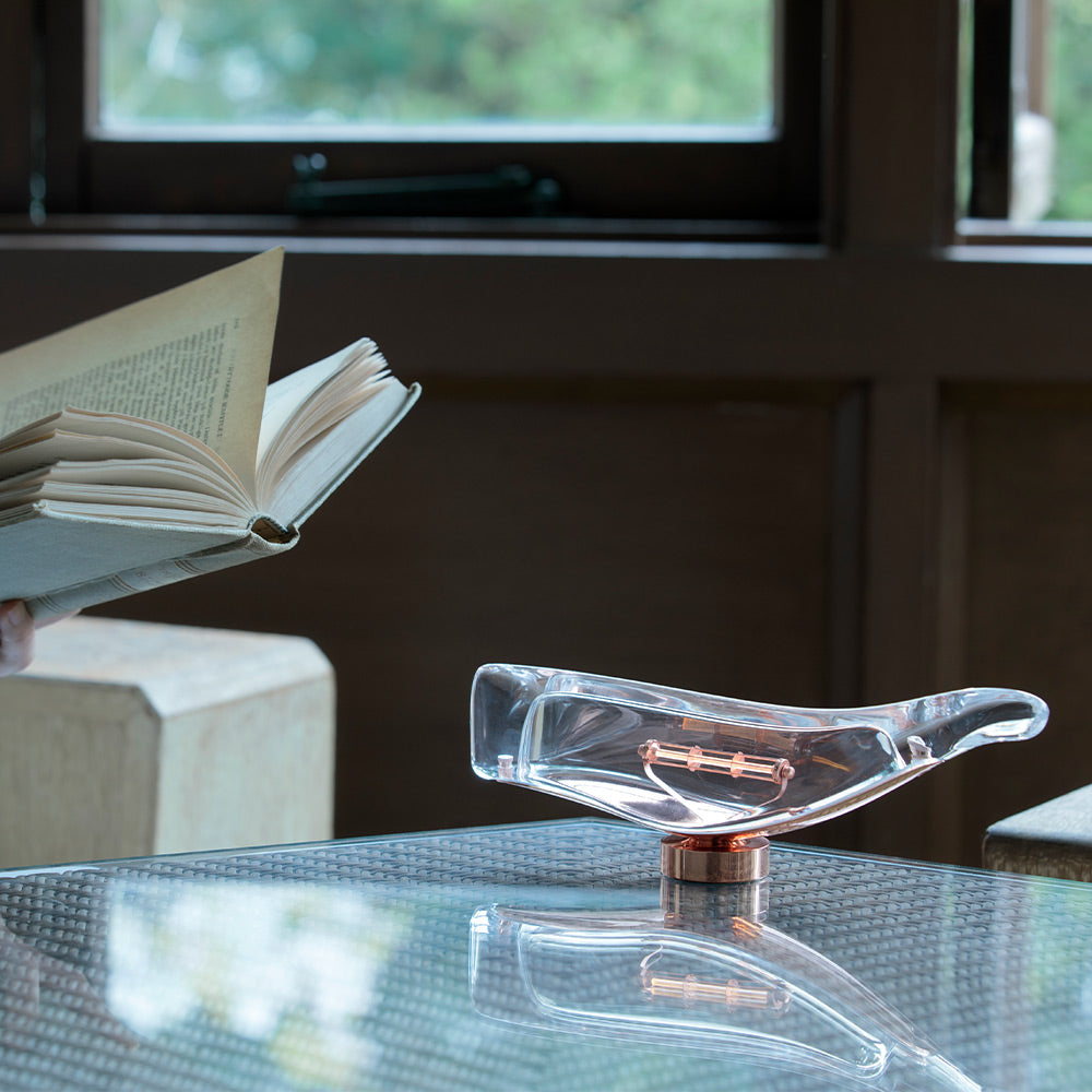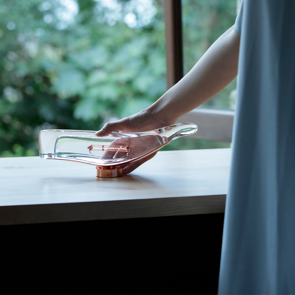 命を吹き込まれたような静かな光を放ちます。点灯していない昼間も、窓辺やチェストの上でオブジェとして美しい存在感を楽しめる一台です。