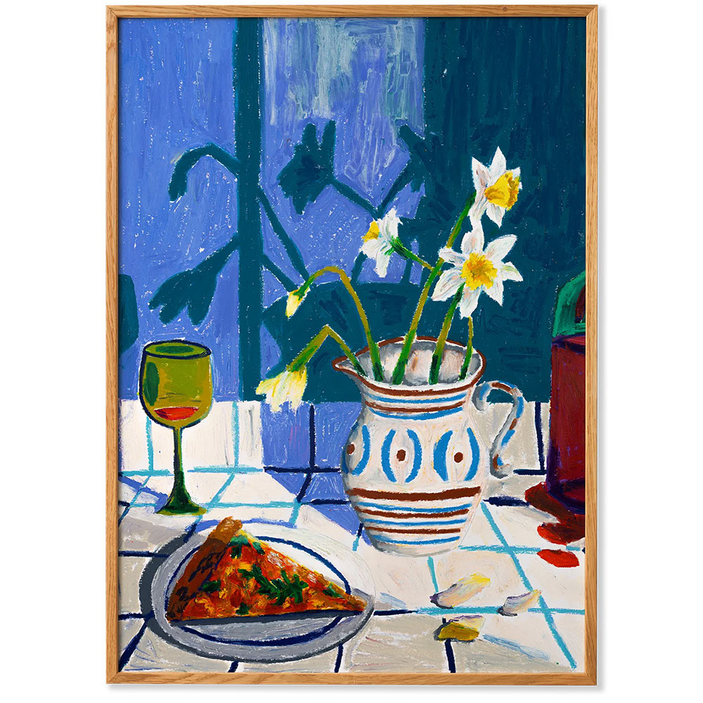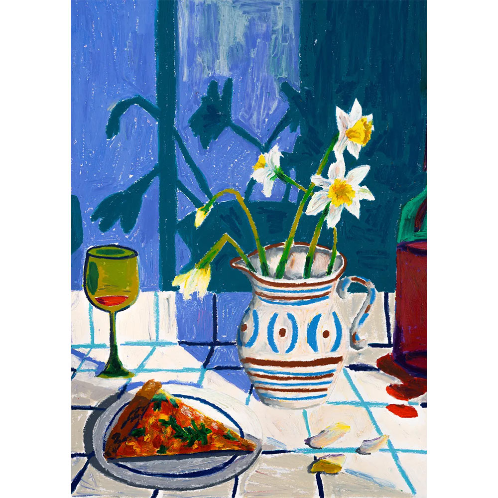 鮮やかなパステルを使って描かれた、暖かい季節に食事や仲間と過ごす喜びを表現した作品。