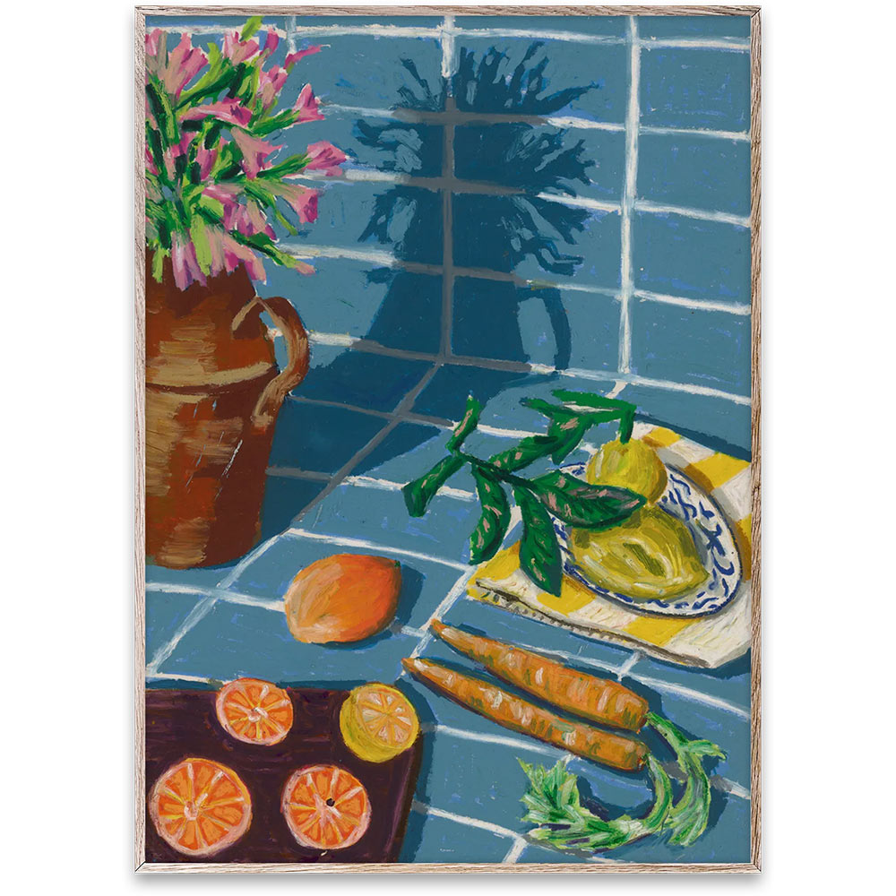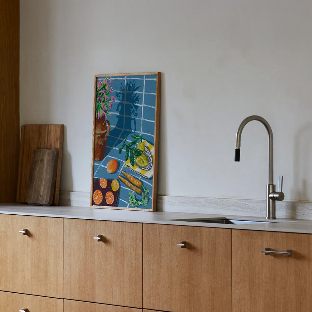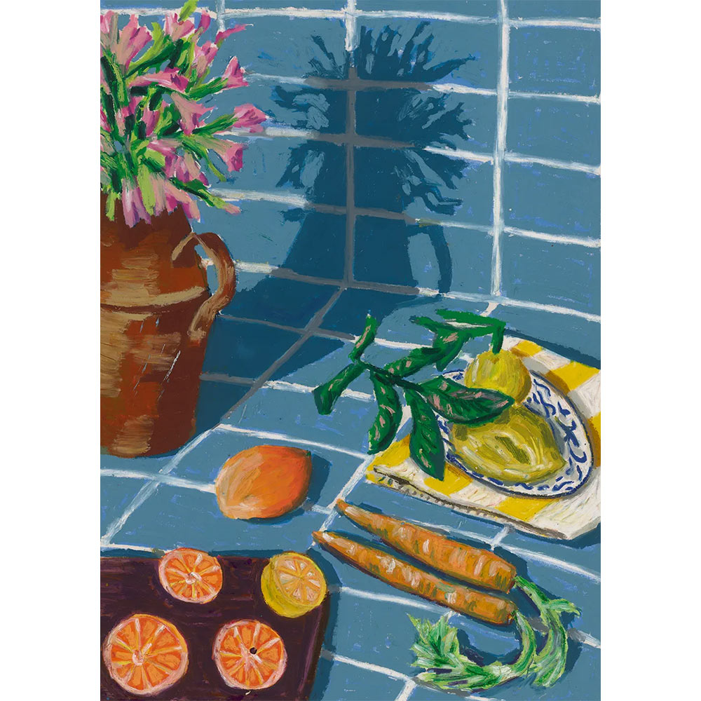 油性パステルとオイルスティックで描かれた、鮮やかなイエローとオレンジの果物や野菜が、印象的な青のキッチンでポップに映えます。