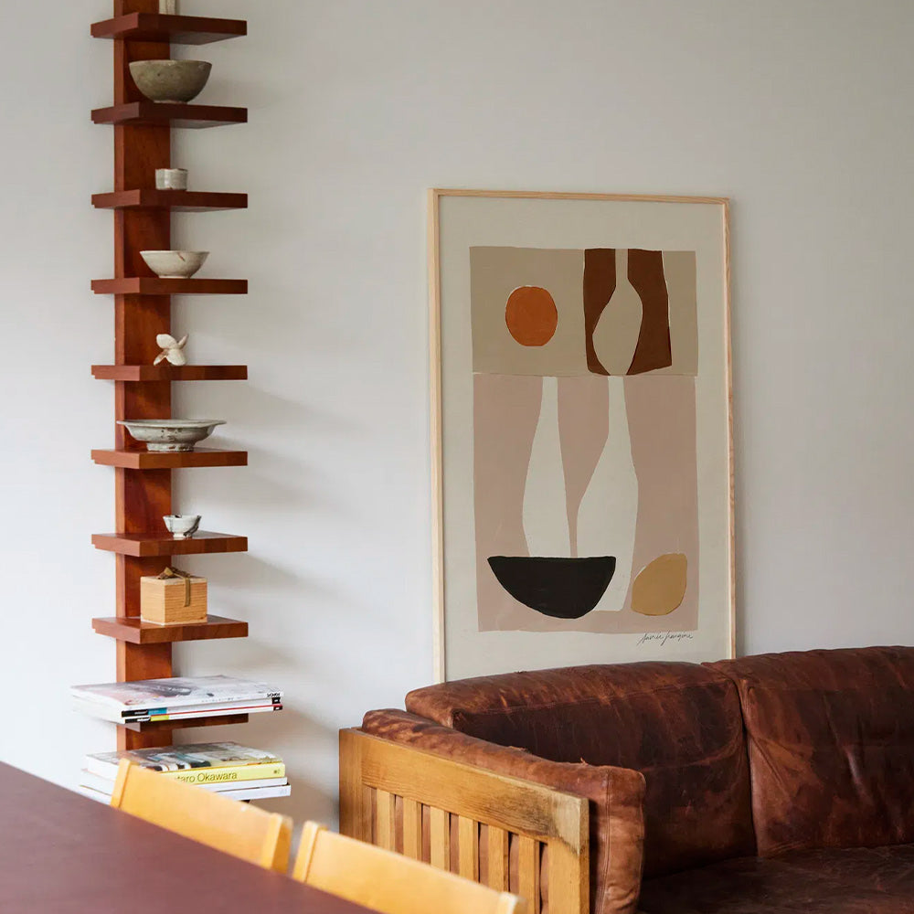 ポイントは、ポスターの色や雰囲気を、ソファや照明など、周辺の家具の色味とリンクさせること。