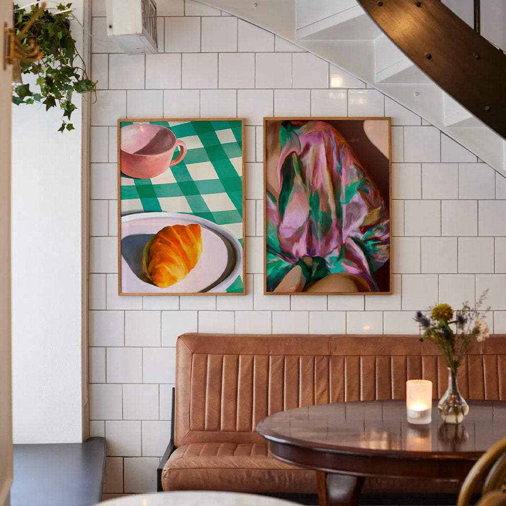 フランスの食卓の二大要素、コーヒーとバターたっぷりのクロワッサンを描いた、チャーミングでリラックスした雰囲気のアート。