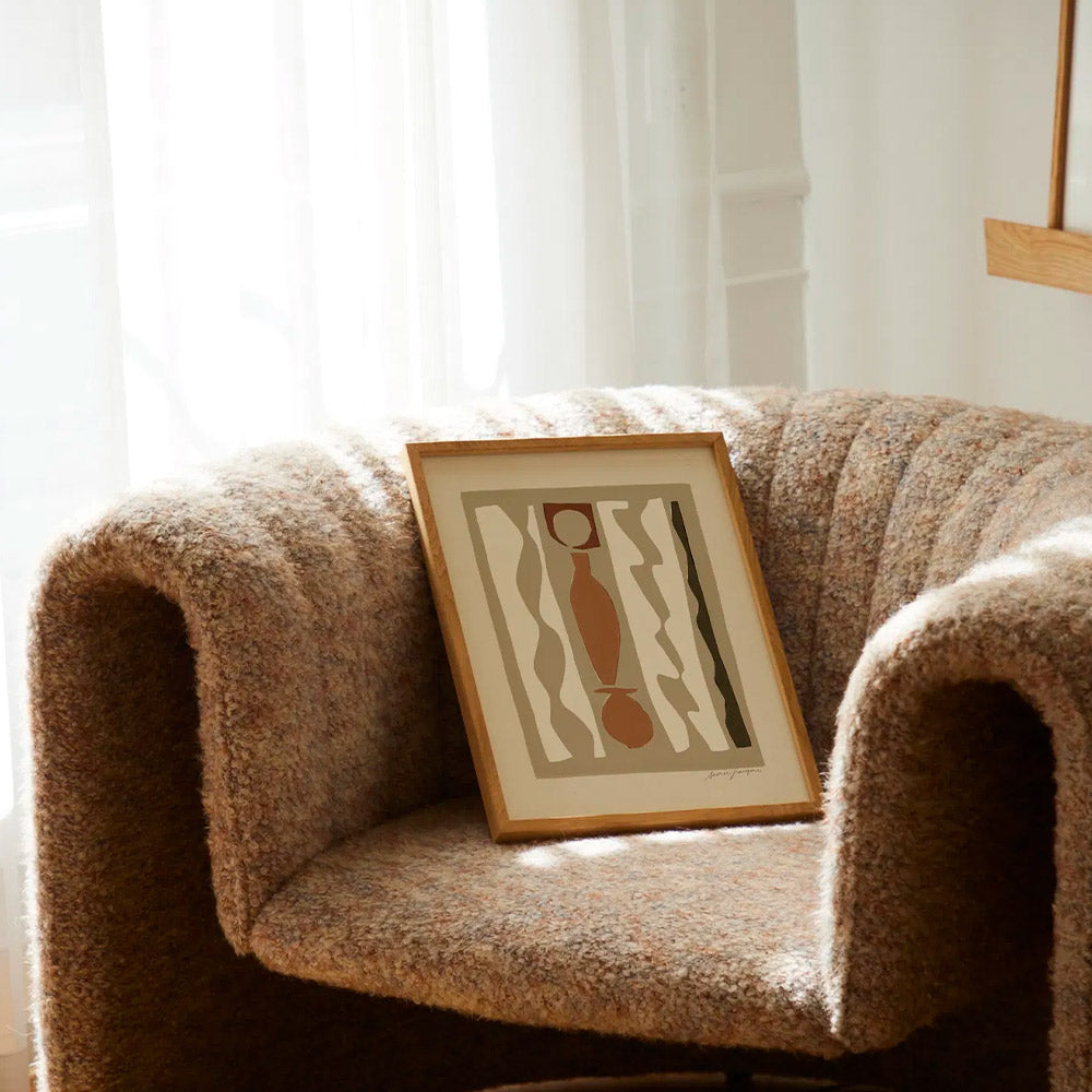 ポイントは、ポスターの色や雰囲気を、ソファや照明など、周辺の家具の色味とリンクさせること。
