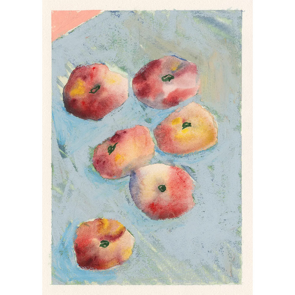つややかな桃のテクスチャを、繊細な水彩と柔らかいパステルで丁寧に表現した作品。