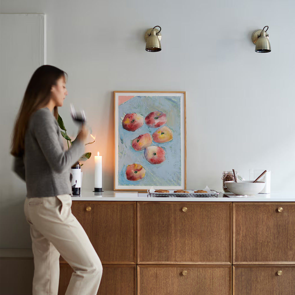 ポイントは、ポスターの色や雰囲気を、ソファや照明など、周辺の家具の色味とリンクさせること。