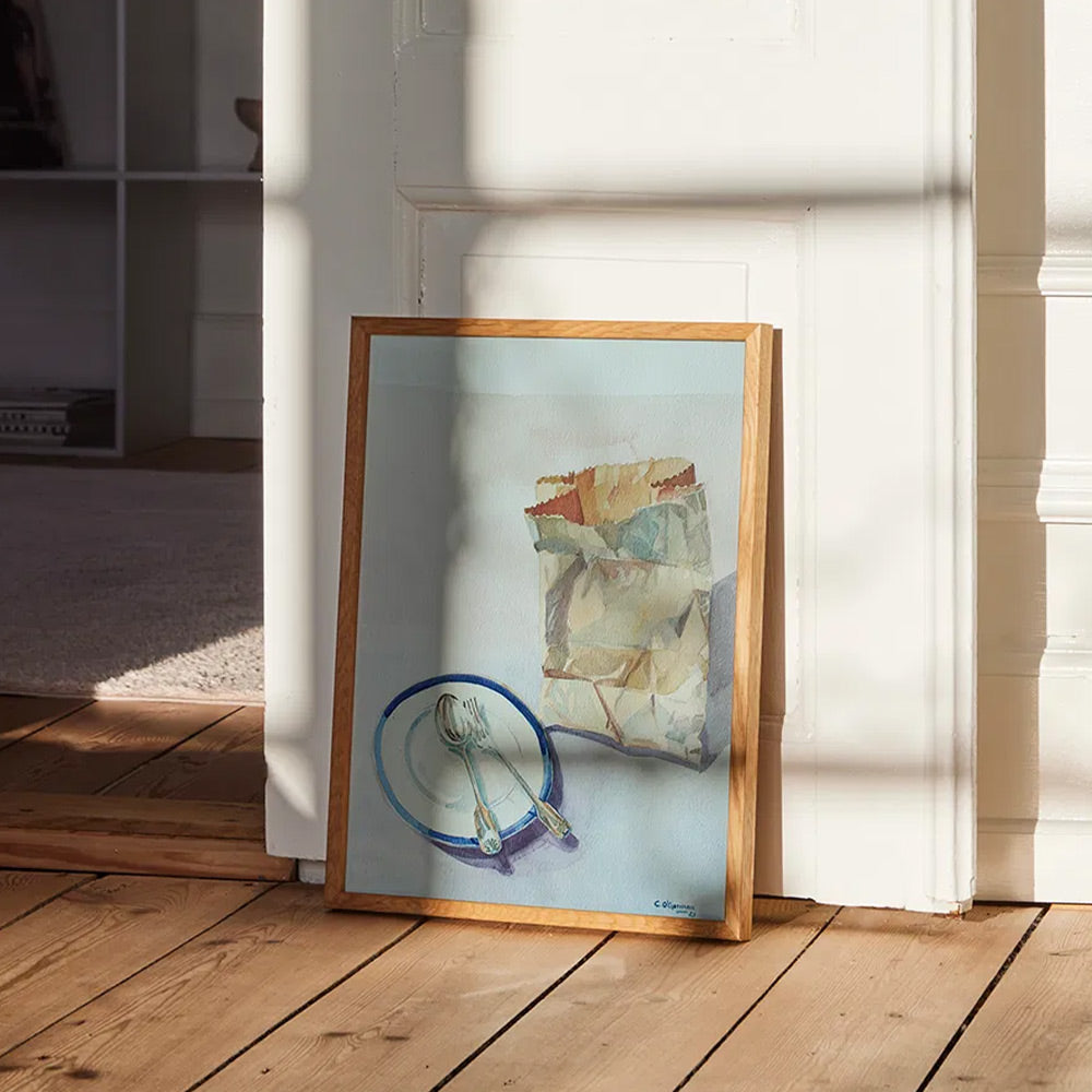 アルゼンチン出身のアーティストCamila o’Gormanが描いた一枚のお皿とカトラリー、そしてくしゃっとした紙袋。