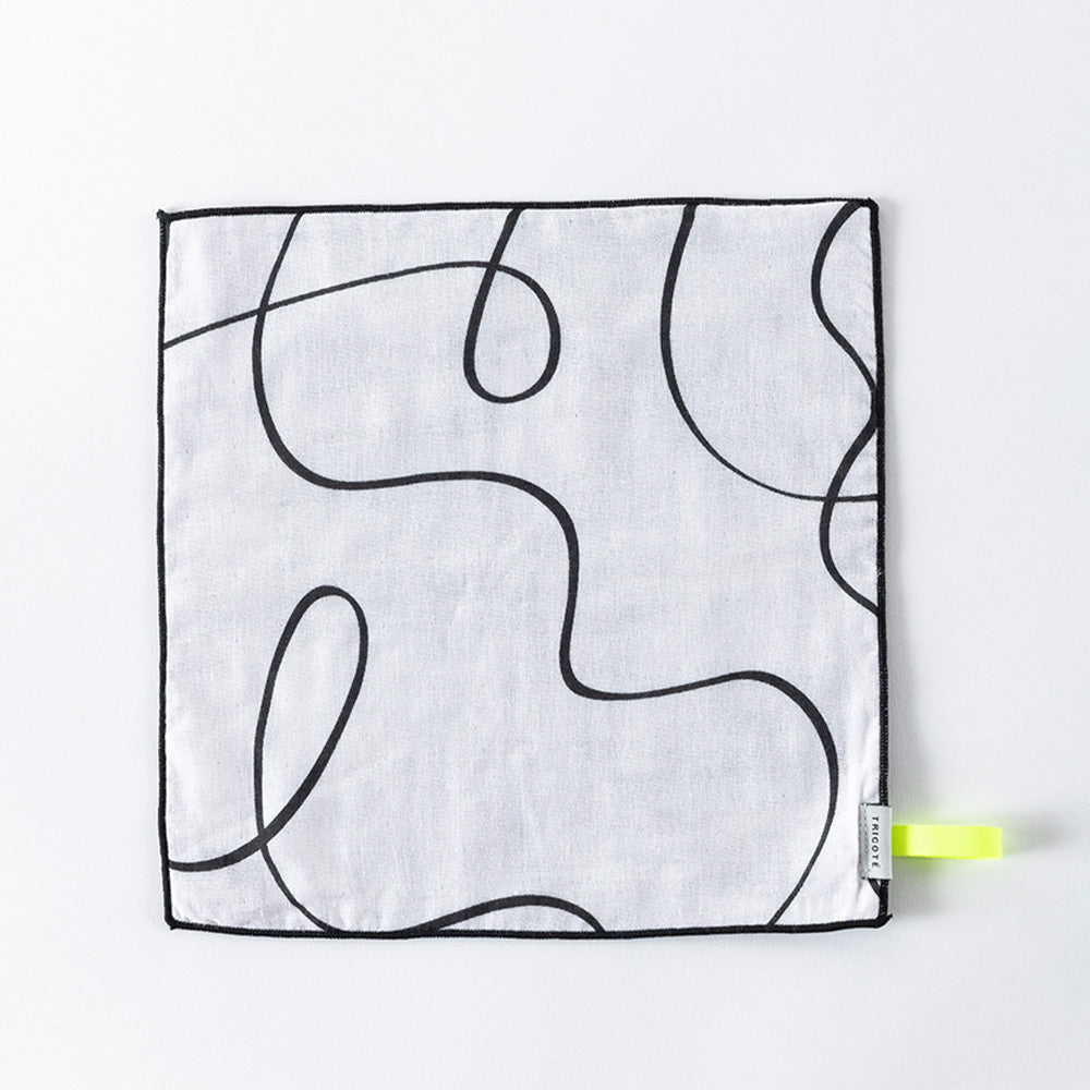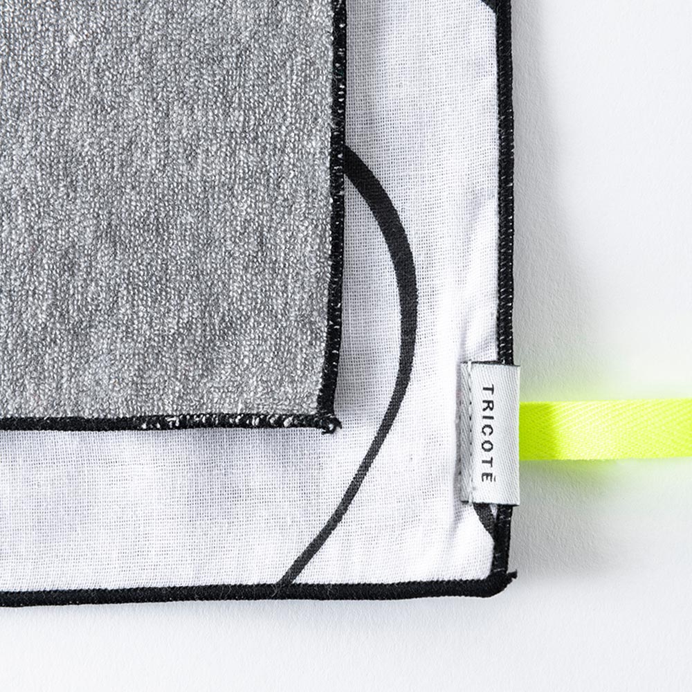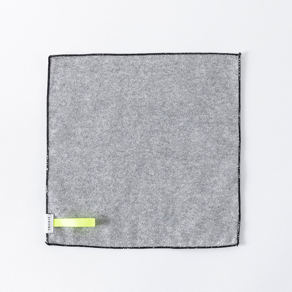 生地開発からテキスタイルデザインまでの工程を、国内生産にこだわるTRICOTE(トリコテ)より、ユニークな柄とタグのカラーリングが目を引くハンカチが届きました。